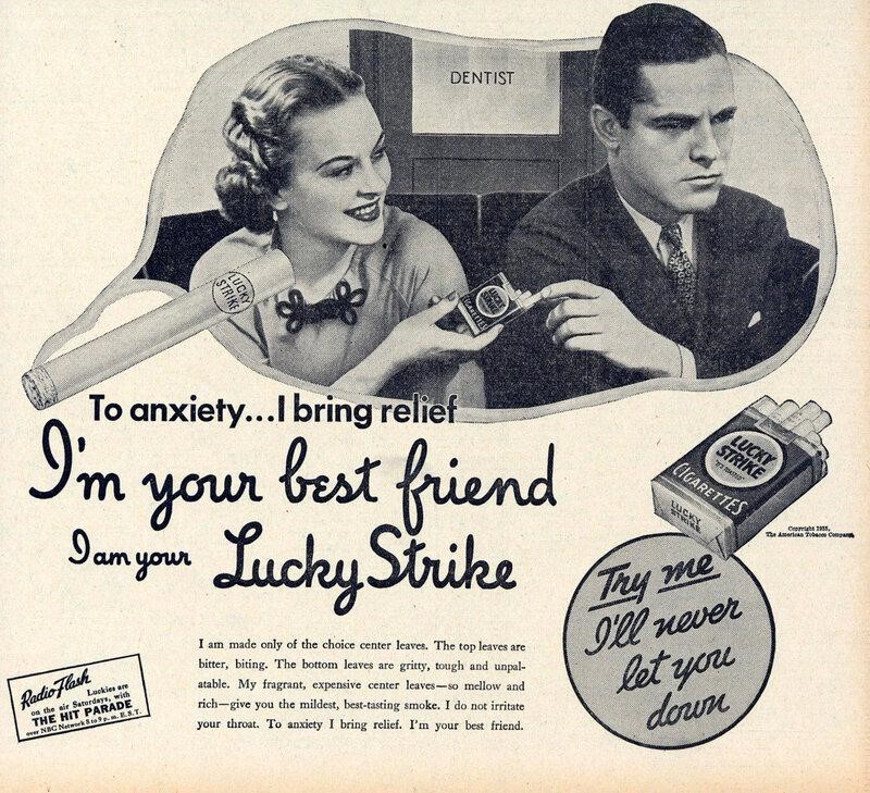 These myths emerged from tobacco industry marketing that positioned smoking as a stress-relief tool. The tobacco industry has targeted people with mental health concerns for decades (see below image of a Lucky Strike ad), contributing to higher-than-average smoking rates and tobacco-related deaths among this population. People with mental health concerns are more likely to die from a smoking-related illness than from their mental health condition. 60% of people with mental health conditions who smoke will die from a tobacco-related illness.